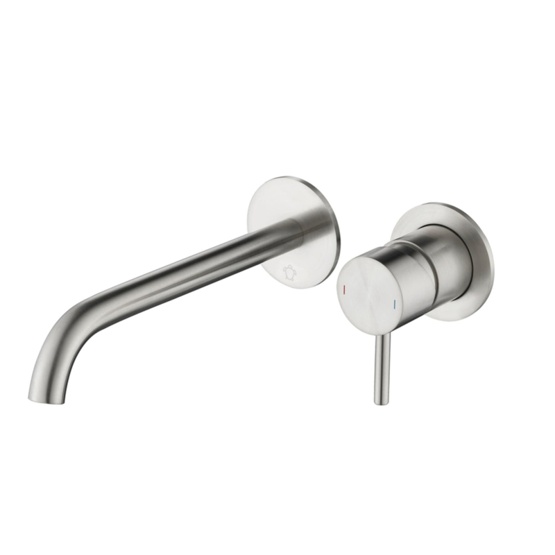 De gebogen uitloop zorgt voor extra bewegingsvrijheid, ideaal voor grotere of dubbele waskommen. De strakke bedieningshendel is ergonomisch geplaatst en subtiel gelaserd met rode en blauwe markering voor warm en koud water.