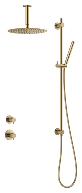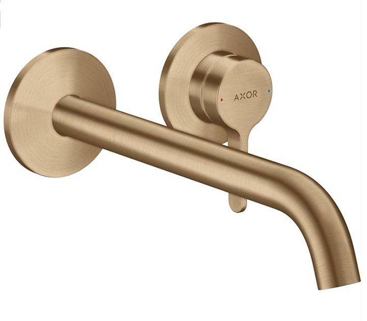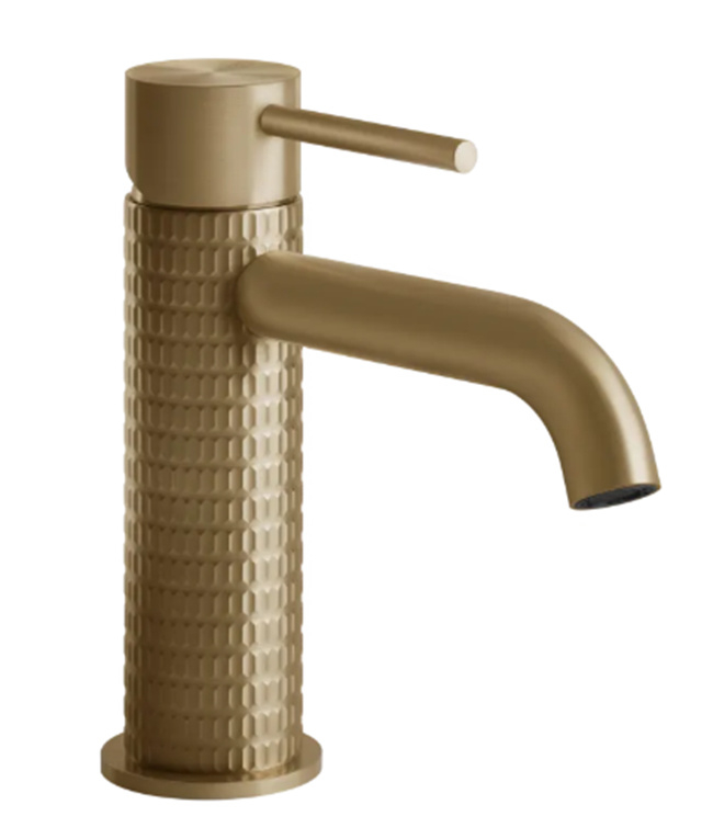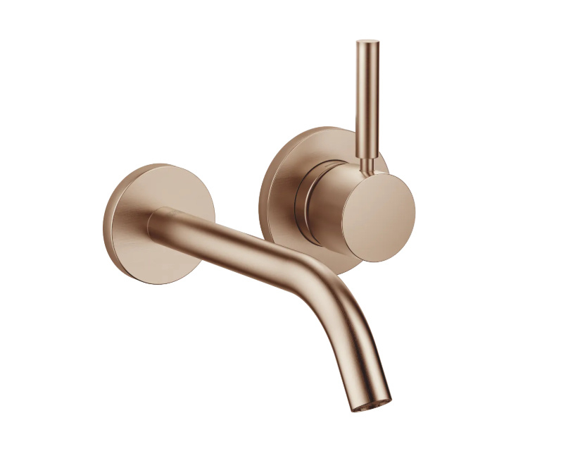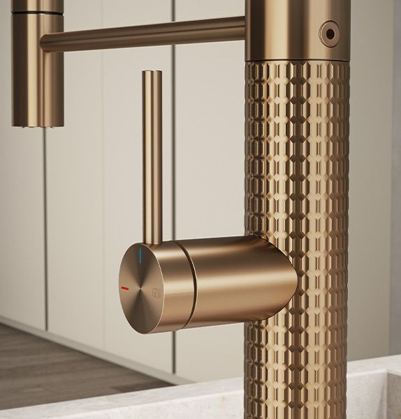 De geborstelde brons kleur past bij Mat of geborsteld brons van Damixa, Hans Grohe, Gessi en Dornbracht kranen.